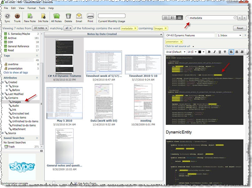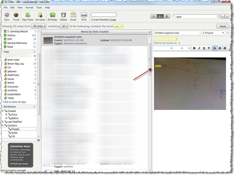 It worth point out that Evernote finds stuff in images as well. One a note containing an image gets to the servers, it goes through an OCR process (Optical Character Recognition), and Evernote then indexes the image. When you perform a search later, it’ll will find words in those images: