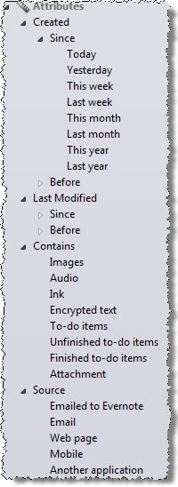 note has been created or modified, what special kind of things it contains (images, audio, ink, attachment…), what’s the source of the note (emailed to Evernote, Email, Mobile, etc.). If there’s a search that I always perform with the same criteria, I can save that search, and access it later through the list of Saved Searches.