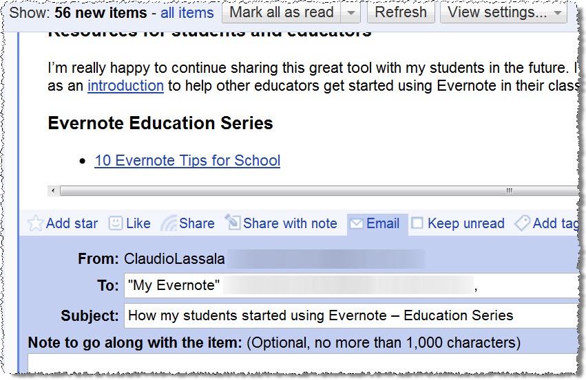 I use Google Reader on my PC to follow blogs, and there I follow the same process: if I find an interesting post, I email it to my Evernote account right from there: