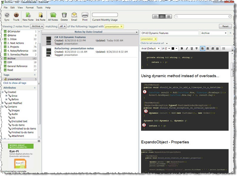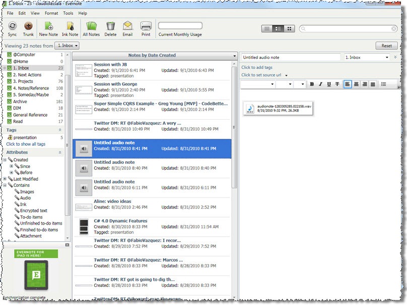 How often do we “keep things at the back of our minds”? I know I used to do a lot of that, and invariably, things get lost. I’ve been dumping pretty much everything into Evernote: quick ideas, things I’d like to try, articles I should read, notes about books I’ve read, meeting notes, pictures of whiteboards, links, audio notes of all sorts, etc. I then organize my notes daily, so I can review them and maybe enhance them after having sat on the idea for a few hours, and also so that I can organize them by applying “tags” and moving them into “notebooks”; that way, I have great chances to find my notes later as fast as possible.