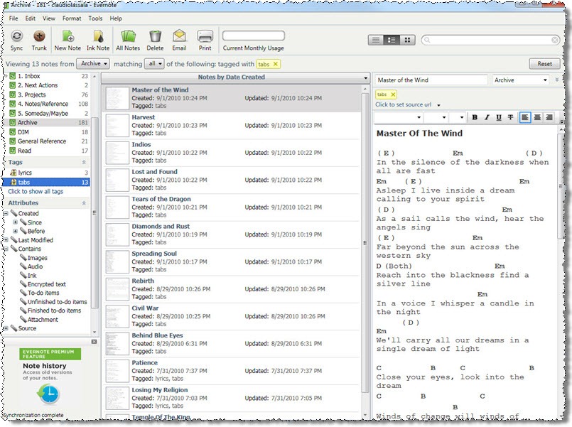 I usually remember how to play the songs I write pretty well, but have a time remembering anything else. When I pick up my acoustic guitar to just play some cover tunes for fun, I always have to look up lyrics, tabs, chords, etc. I’m now adding that all to Evernote.